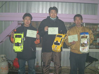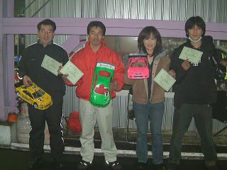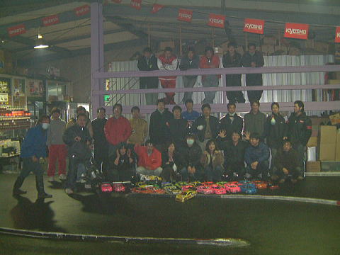 毎年恒例となった冬の4時間耐久レースが2月25日深夜開催された。当日はPM7:00からバーベキュー&飲み会が行われ、例年ながらレース開始前には酔っ払いが続出し取りまとめるのが困難極まる状態でPM10時30分レーススタート!チーム数は店側で事前に決定していた6チームがエントリー。レース開始後30分間はドライバーチェンジ無しの1ドライバー・1マシーンで走行しなければならず各チームメインドライバーを選出した。序盤「かわうそチーム」トップに立ち、ドリームチーム・DVチームが同ラップで続く。1時間経過時点でほぼ全チームがドライバーチェンジを終え流れも落ち着いてきたころ、2位以下に20周以上の差をつけトップを走行中の「かわうそチーム」が第3ドライバーにチェンジ!波乱が起きたのはその直後「かわうそチーム」のマシーンクラッシュでまたまたドライバーチェンジを余儀なくされた。しかしドライバーチェンジにと間取り逆にトップとなった「DVチーム」に30周ほどの差をつけられてしまった。その後トップに上がった「DVチーム」が4時間を走りきりゴール!2位「かわうそチーム」3位「チーム奈良君1人」4位「チームフミオバスターズ」5位「ドリームチーム」6位「イナバウワーチーム」と言う結果となりました。3位入賞の奈良君一人チームは、毎年の耐久レースで2時間は走行し、チーム名にもなっているメインの奈良選手が開始早々エンジンが壊れてしまい挙句の果てにシリオエンジンで走行。レース終了30分前に、イナバウアーチームの吉田選手が秘密兵器?トラックボディを投入し9秒台を叩き出し会場を沸かせた。レース終了後はラジコンキットなど豪華景品が当たる抽選会が行われ、参加者はレースよりも抽選会に真剣のようでした。