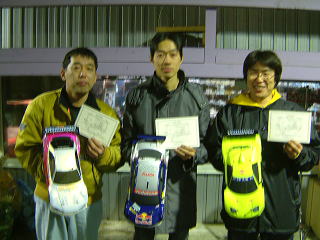 | 1月14日に電動ツーリングシリーズ第2戦が行われた。注目はストリートラジコンでは負け知らずの???荒川選手がどのような走りをするのかに注目が集まった。期待とは裏腹に、ミスのない走りでスポーツマンクラスでライバルの島崎選手を抑え見事優勝をきめた。オープンクラスではフロントダンパーのみフリクションという奇怪なセッティングをしていた岡島選手が唯一42ラップに突入し1.2ラウンドを連取してシリーズ初優勝し、2番手には僅差で第1戦優勝者の新藤選手、3位に福田選手が入賞した。BAYサーキットでミニッツレーサーのエキスパート舛井選手は3ラウンド共に同ラップほぼ同タイムでゴールし、安定した走りで次戦の上位入賞が期待される。 | ||||||||||||||||||||||||||||||||||||||||||||||||||||||||||||||||||||||||||||||||||||||||||||||||||||||||||||||||||||||||||||||||||
